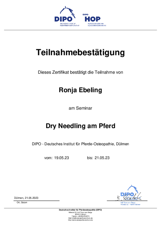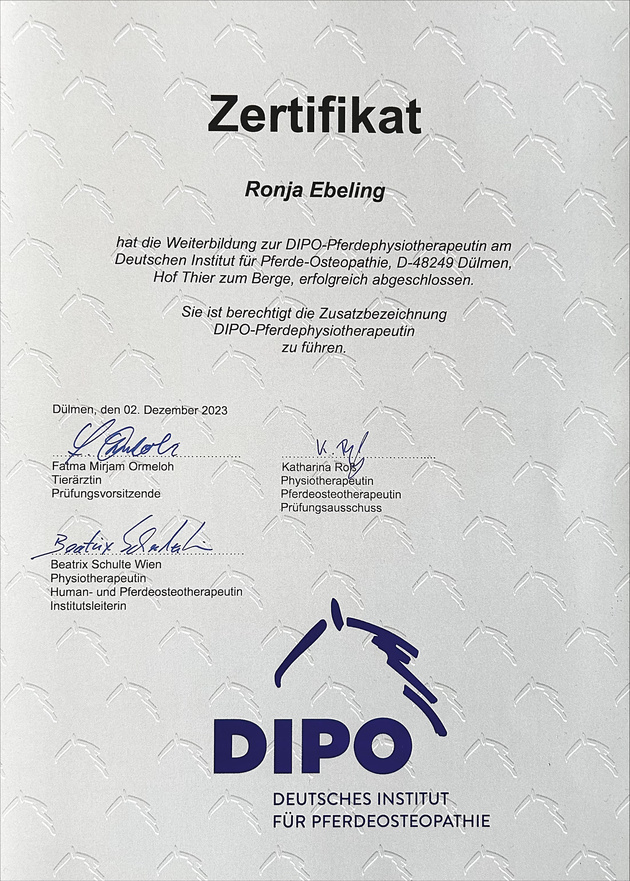 - 2022-2023: Ausbildung zur Pferdephysiotherapeutin am DIPO (Deutsches Institut für Pferdeosteopathie)