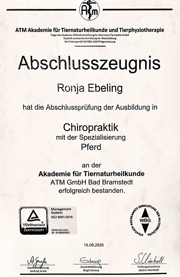 - 2024-2025: Ausbildung zu Pferdechiropraktikerin am ATM (Akademie für Tiernaturheilkunde)